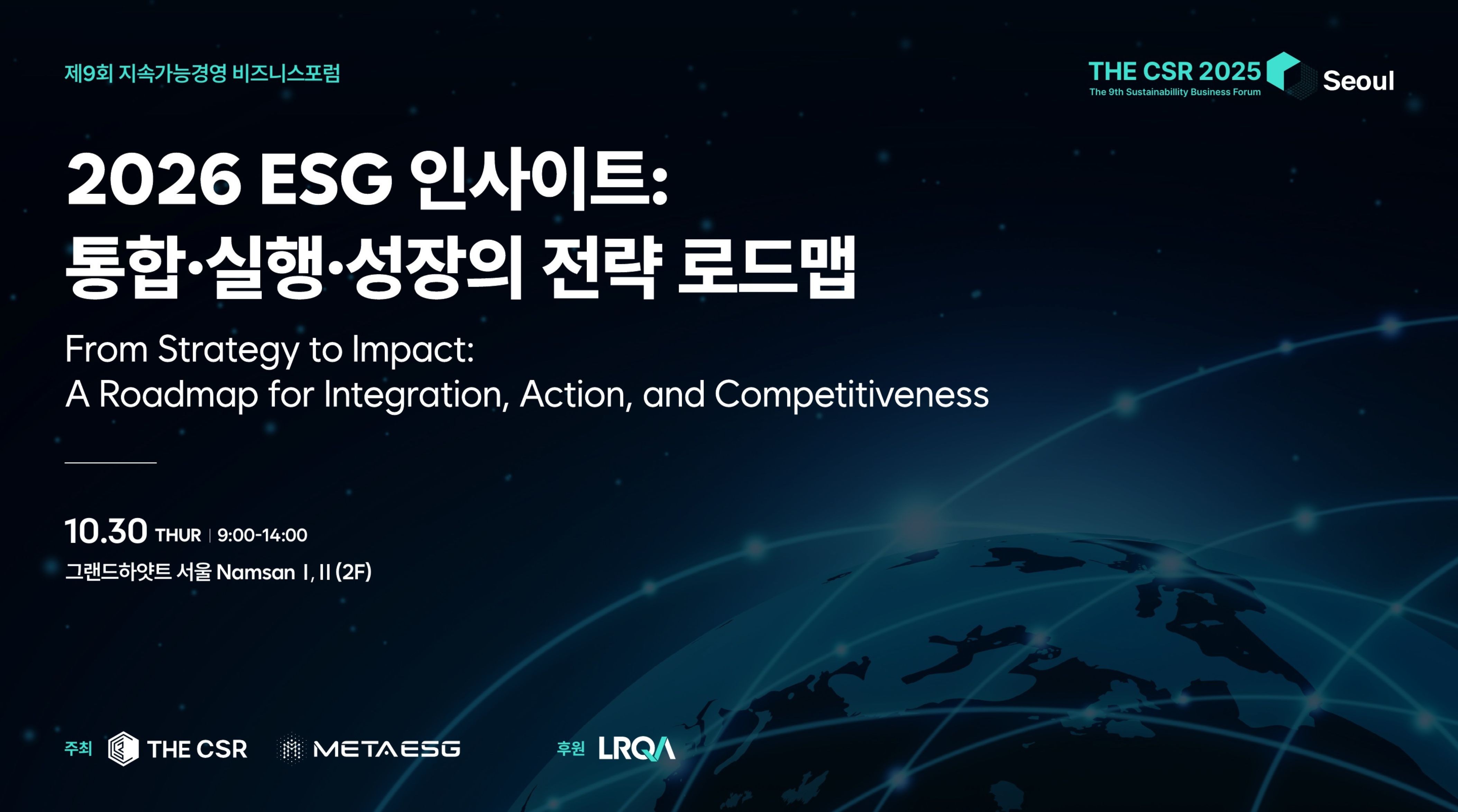 제9회 지속가능경영 비즈니스포럼『THE CSR 2025 | Seoul』은 특별히 더씨에스알에 지난 12년 동안 변함없는 성원을 보내주신 고객사 및 관계사를 초청해 감사를 표하는 자리로 마련되었습니다. 급격히 변하는 ESG 환경 속, 공시제도 변화, 기후공시 의무화, 공급망 리스크 관리 등 주요 이슈를 짚으며 “ESG는 보고서나 규제를 넘어 기업의 성장 언어로 자리 잡고 있다”는 메시지를 함께 확인한 뜻깊은 시간이었습니다.